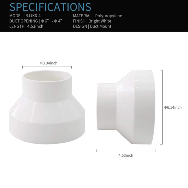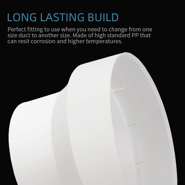 Ống giảm tốc được làm bằng vật liệu PP cao cấp, thân thiện với môi trường, bền và chắc chắn, thích hợp cho hệ thống thông gió nhà bếp/gia đình, truyền nhiệt và thông gió v.v.